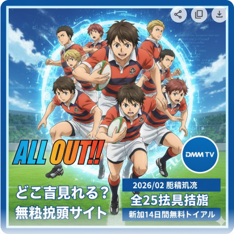 アニメ『ALL OUT!!』は、2026年2月8日時点でDMM TVにて全25話が見放題配信されています。月額550円(税込)のサービスで、初回利用者には14日間の無料トライアルが用意されているため、費用をかけずに全話視聴することも可能です。史上初の本格高校ラグビーアニメとして、体格差に挑む主人公の姿、15人のチームメイトが織りなす群像劇、迫力ある試合描写など、見どころの多い作品です。ラグビーのルールを知らなくても主人公と一緒にゼロから楽しめる設計になっていますので、気になった方はぜひDMM TVでチェックしてみてください。