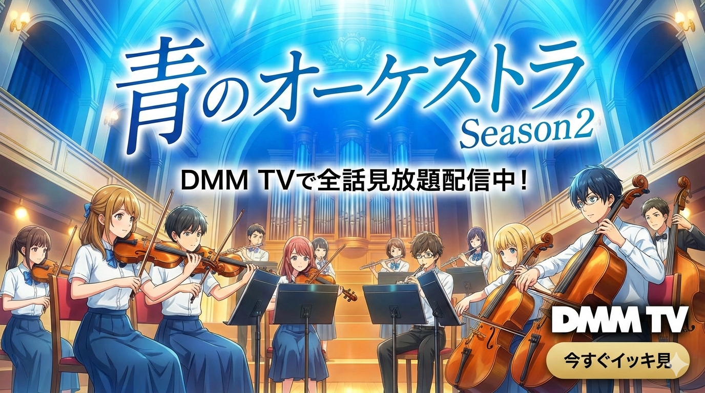 「青のオーケストラ Season2」は、プロ演奏家の本格的な音楽、繊細なキャラクター心理描写、青春×恋愛のドラマが高次元で融合した2025年秋〜2026年冬の注目作です。DMM TVなら月額550円(税込)の見放題で、Season1全24話とSeason2を好きなタイミングで視聴できます。最終話の放送を3月1日に控えた今こそ、全話イッキ見で作品世界に浸る絶好のチャンスです。初回14日間の無料体験を活用して、コンサートホールにいるかのような臨場感あふれる演奏シーンをぜひ体験してみてください。
