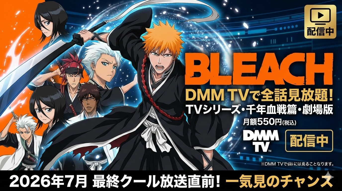 2026年2月25日時点でのDMM TVにおけるBLEACHの配信状況をまとめました。結論として、BLEACHのアニメシリーズ・劇場版・ミュージカル作品はDMM TVですべて見放題で視聴できます。