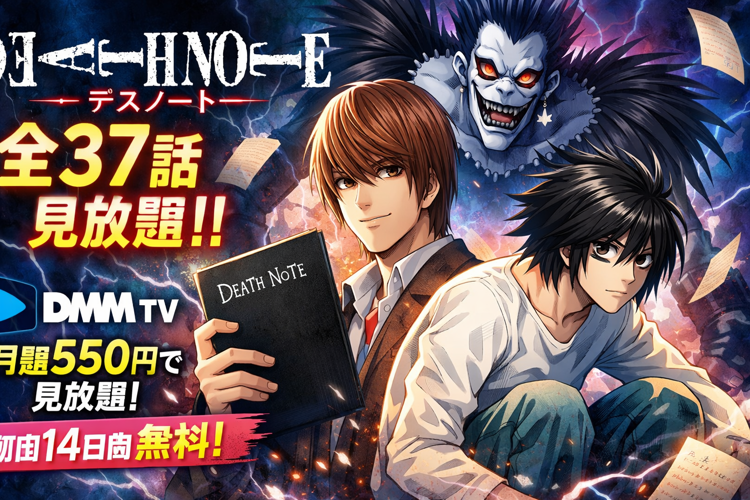 DMM TVなら月額550円(税込)で全37話が見放題。さらに総集編の「リライト」シリーズも追加料金なしで楽しめます。初回14日間の無料体験を活用すれば、費用をかけずに全話を一気見することも可能です。まだ見たことがない方も、久しぶりに見返したい方も、この機会にぜひDMM TVで「DEATH NOTE」の世界に飛び込んでみてください。