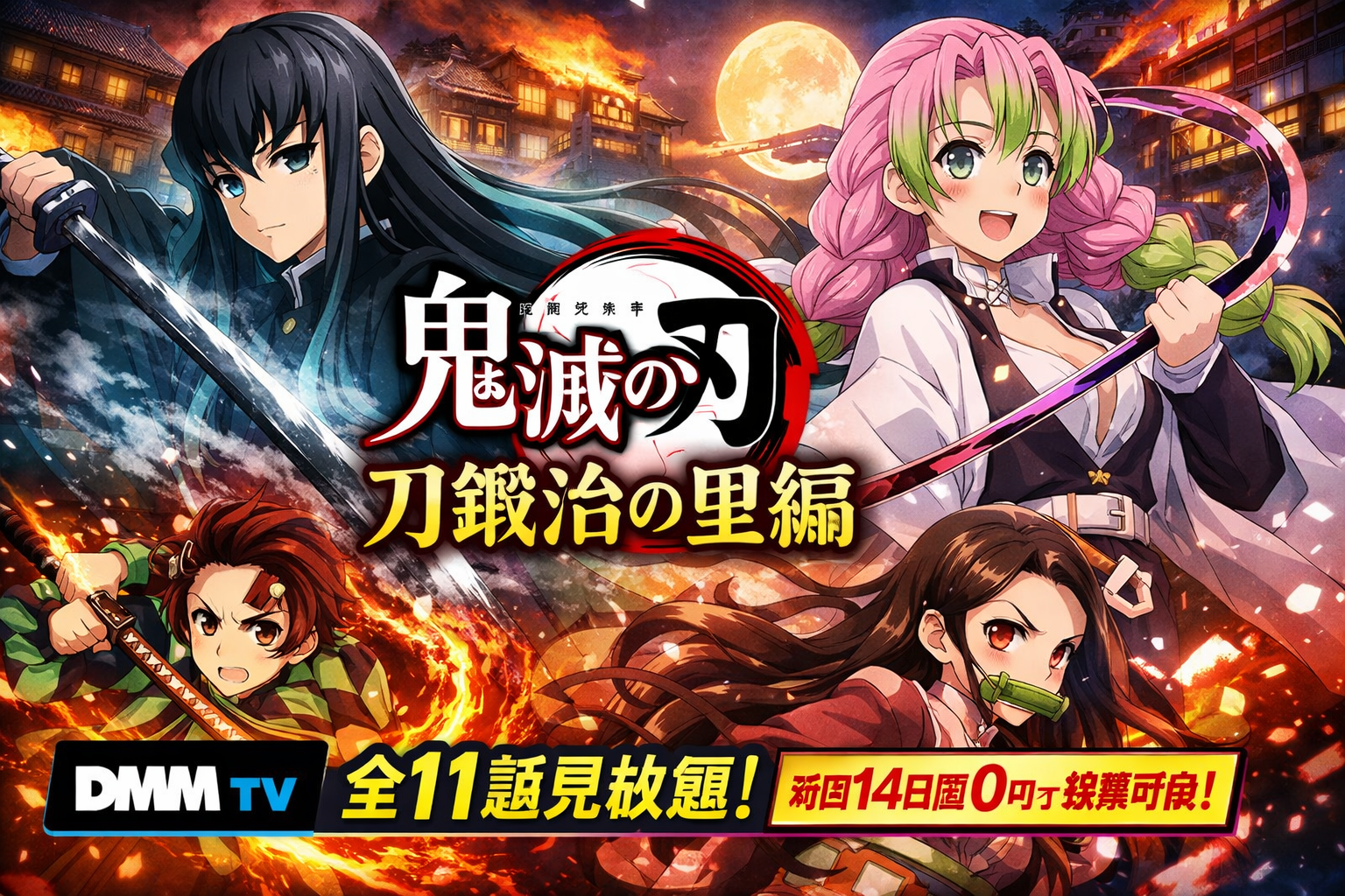 2026年2月25日現在、「鬼滅の刃 刀鍛冶の里編」はDMM TVにて全11話が見放題で配信されています。追加課金は一切不要で、月額550円(税込)のDMMプレミアム会員であれば、第1話の1時間スペシャル(約50分)から最終第11話の70分拡大版まで、すべてのエピソードをいつでも視聴できます。さらに、初回14日間の無料体験期間を利用すれば、実質0円で全話を楽しむことも可能です。