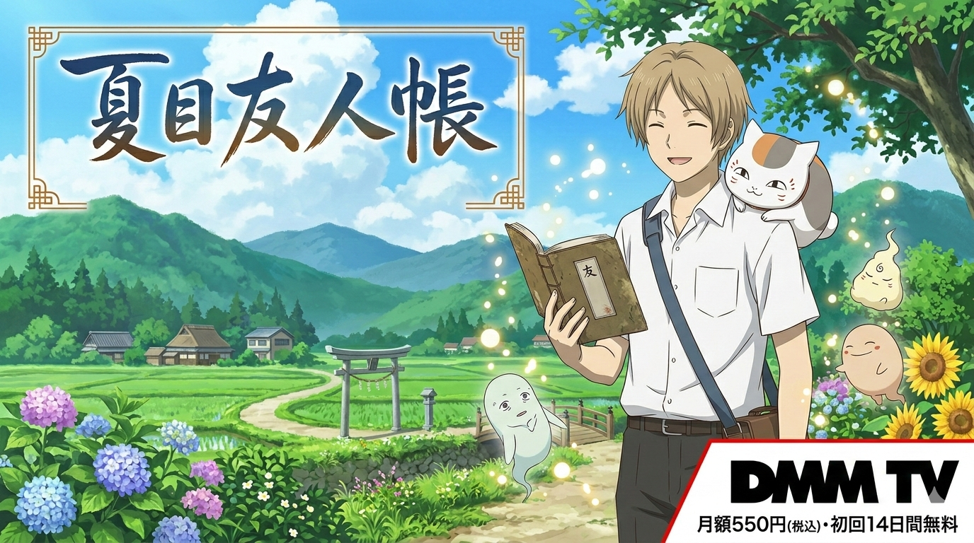 アニメ「夏目友人帳」は、DMM TVで第1期から第7期(漆)まで全話見放題で配信中です。OVAや劇場版「石起こしと怪しき来訪者」も対象で、月額550円(税込)・初回14日間無料で今すぐ視聴を始められます。この記事では配信状況の詳細から作品の魅力、口コミ・評判まで徹底的にまとめました。