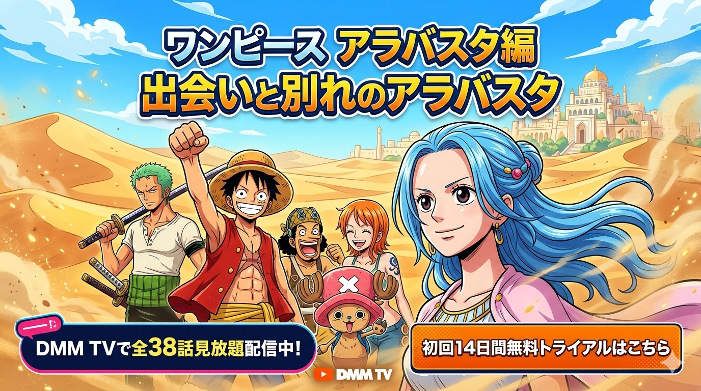 「ワンピース アラバスタ編 出会いと別れのアラバスタ」は、DMM TVで全38話が見放題配信中です。月額550円(税込)のDMMプレミアムに加入すれば、初回14日間の無料トライアル期間中にすべてのエピソードを追加料金なしで視聴できます。