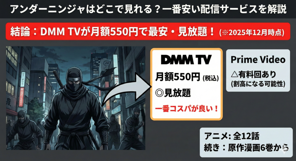 アニメ「アンダーニンジャ」はどこで見れる?2025年12月時点で最安に視聴できる配信サービスを解説。配信状況の一覧や全話まとめ見、続きが原作何巻からかも確認できます。 -