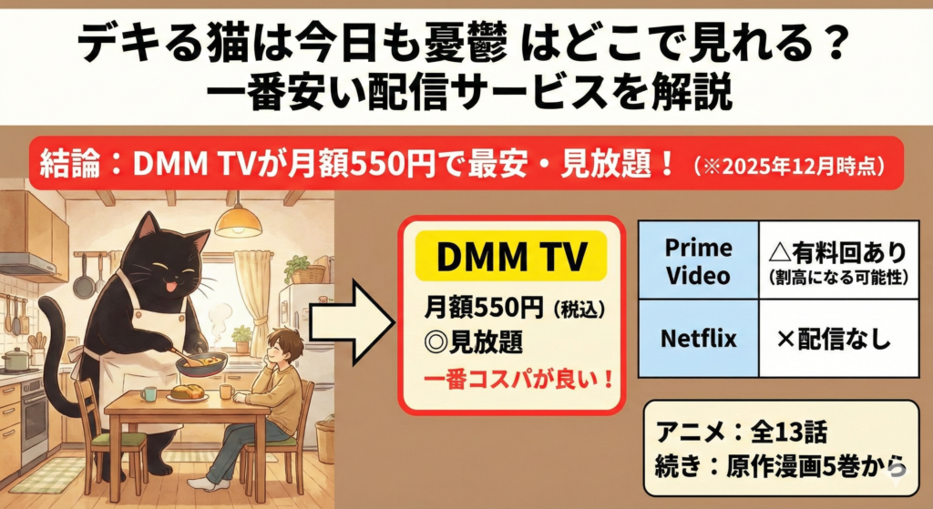 アニメ「デキる猫は今日も憂鬱」はどこで見れる?2025年12月時点で最安に視聴できる配信サービスを紹介。配信状況の比較や全話まとめて見れるか、原作の続きがどこからかも解説します。 -