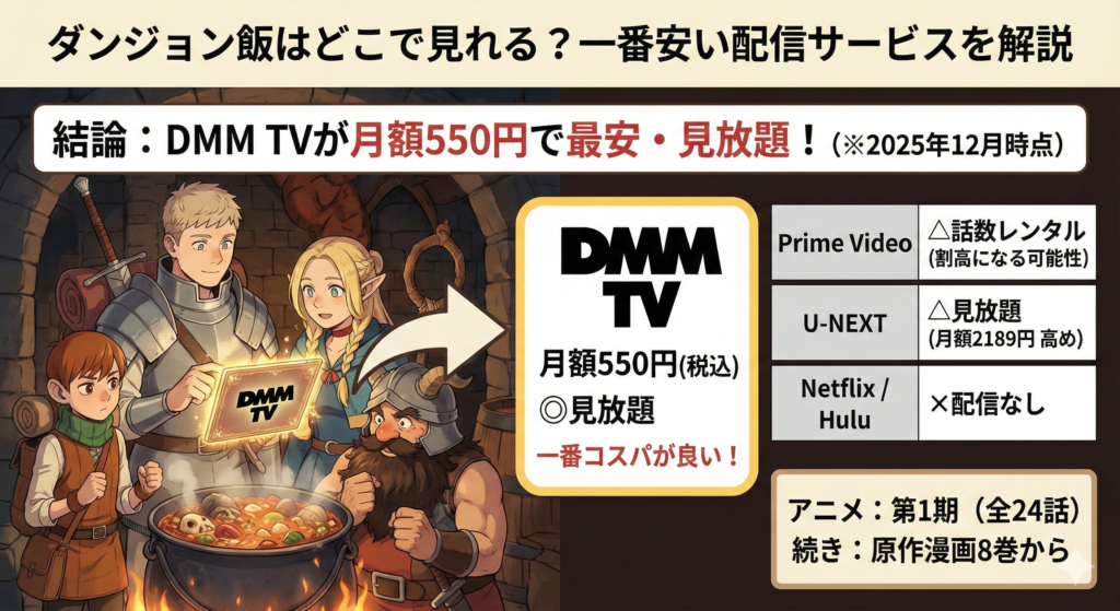 アニメ「ダンジョン飯」はどこで見れる?2025年12月時点で最安に視聴できる配信サービスを解説。配信状況一覧、Primeとの違い、アニメの続きが原作何巻からかも分かります。