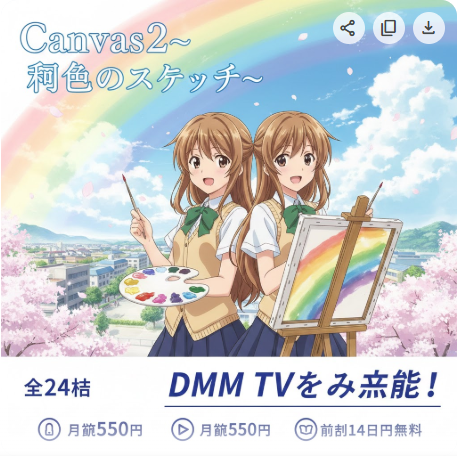 Canvas2~虹色のスケッチ~の配信状況を2026年2月9日に確認しました。DMM TVでの見放題情報、あらすじ、声優、見どころ、評判・口コミまで網羅。月額550円・初回14日間無料で全24話を視聴できます。 -