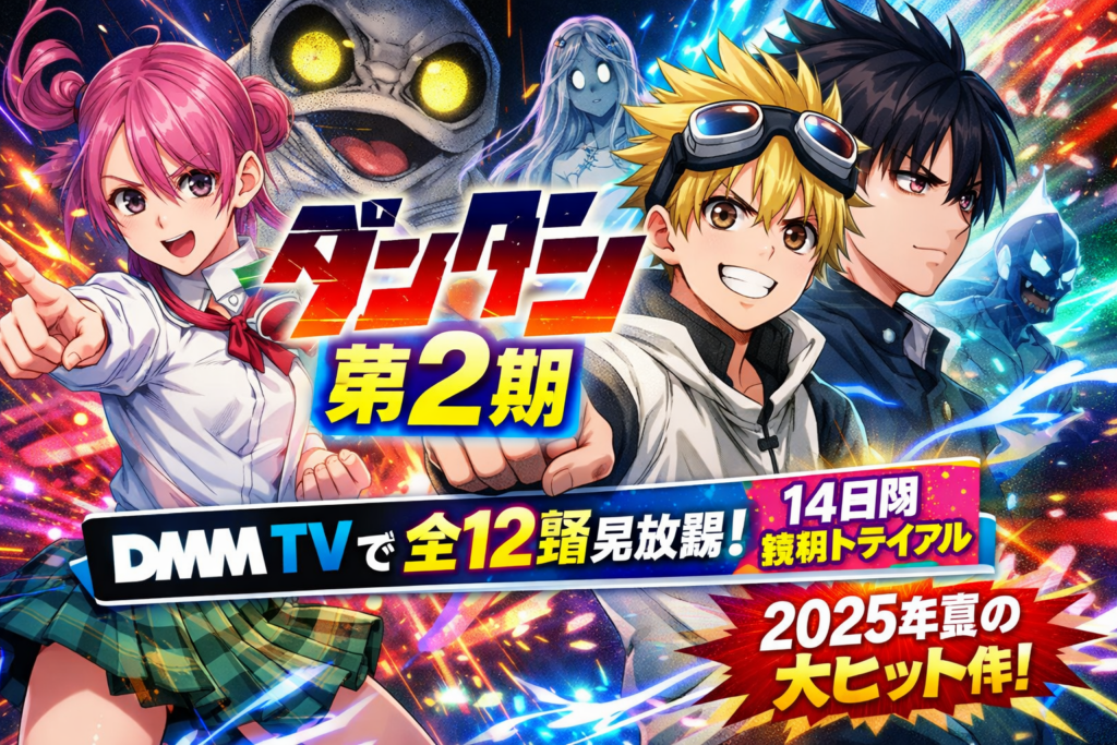 アニメ『ダンダダン』第1期(全12話)はDMM TVで見放題配信中。月額550円・初回14日間無料で全話視聴可能です。作品情報・見どころ・口コミ評判・第2期第3期の視聴ロードマップまで徹底解説します。