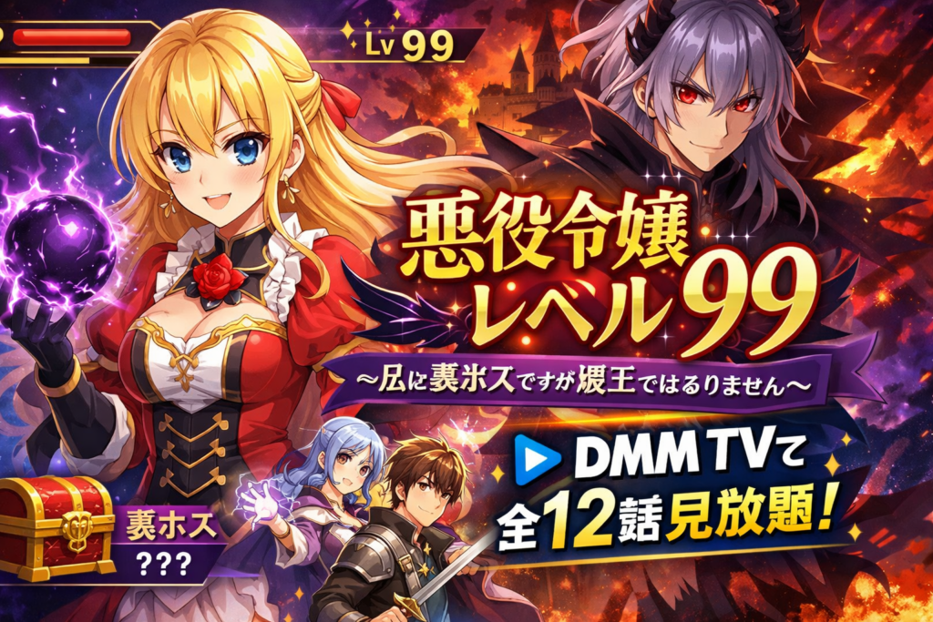 「悪役令嬢レベル99~私は裏ボスですが魔王ではありません~」はDMM TVで全12話見放題配信中。月額550円・初回14日間無料で視聴可能。配信状況・見どころ・口コミ評判を2026年2月28日時点の最新情報でまとめました。 -