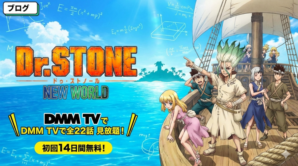 Dr.STONE NEW WORLD(第3期)はDMM TVで全22話見放題配信中。月額550円・初回14日間無料で大航海編&宝島編をイッキ見可能。2026年4月放送の第4期最終章に向けて今がベストタイミング。見どころ・口コミも紹介。 -
