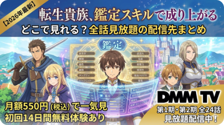 アニメ「転生貴族、鑑定スキルで成り上がる」はDMM TVで第1期・第2期の全24話が見放題配信中。月額550円で視聴でき初回14日間は無料体験可能。第3期最新情報や口コミ、お得な視聴方法をまとめました。 -
