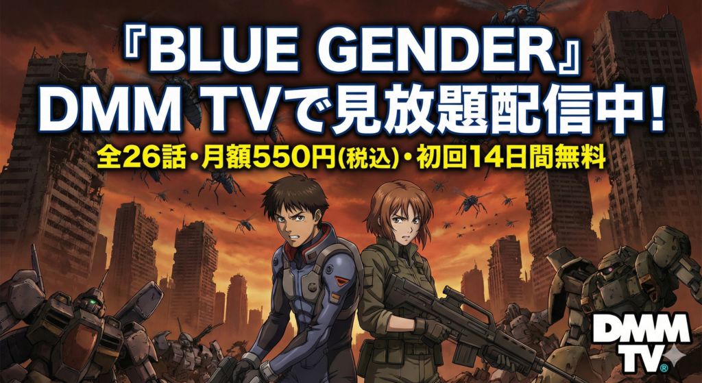 『BLUE GENDER』はDMM TVで見放題(全26話)。月額550円・初回14日間無料で、終末SFサバイバルを視聴できます。【2026-01-18時点】 -