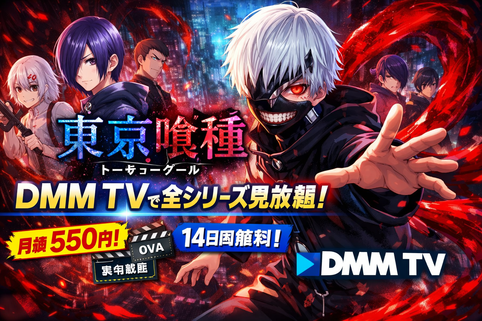 DMM TVなら、TVアニメ全48話・OVA2作品・実写映画・舞台版まで、東京喰種トーキョーグールの全コンテンツが月額550円(税込)の見放題で楽しめます。初回14日間の無料体験を利用すれば、費用をかけずに全話を視聴することも可能です。まだ見たことがない方も、久しぶりに見返したい方も、この機会にDMM TVで東京喰種トーキョーグールの世界に飛び込んでみてください。
